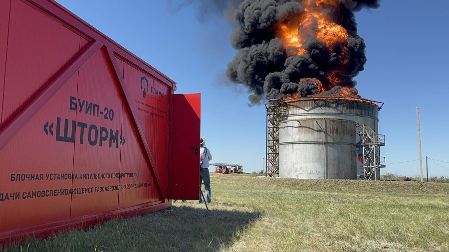На собственном полигоне ГК «Пламя», находящемся в г. Рязань проведены испытания установки БУИП-20, состоящей из 20 установок импульсного пожаротушения для подачи самовспенивающейся газоаэрозоленаполненной пены УИП-242-240. Установка рассчитана на защищаемую площадь зеркала резервуара 400 м2, что соответствует резервуару вместимостью 5000 м3.