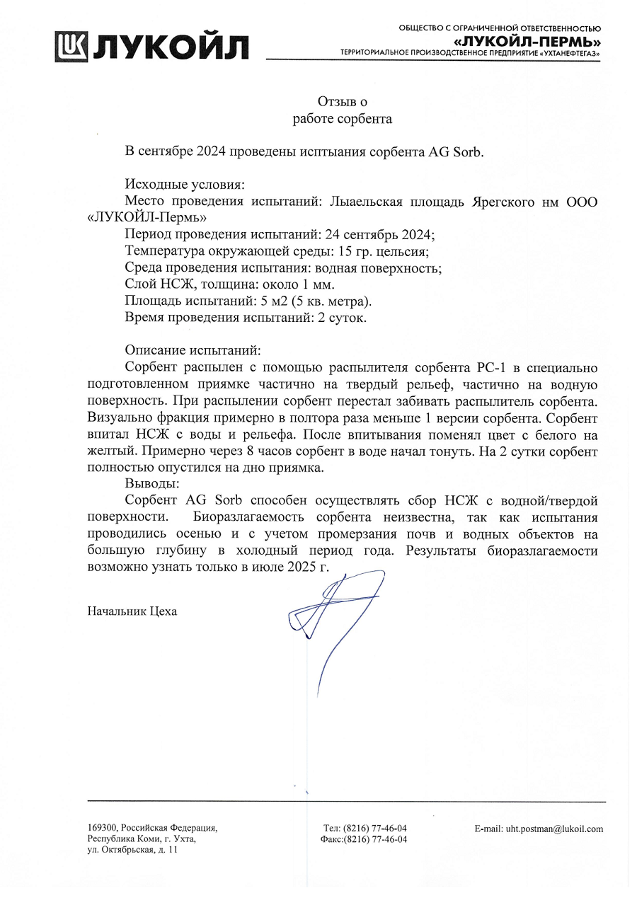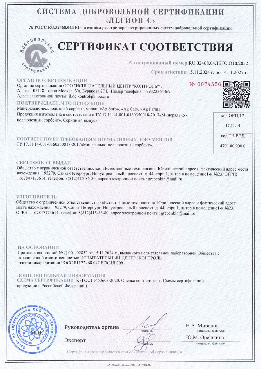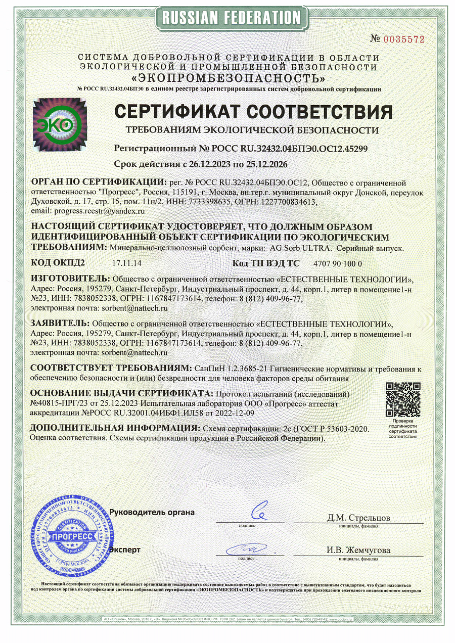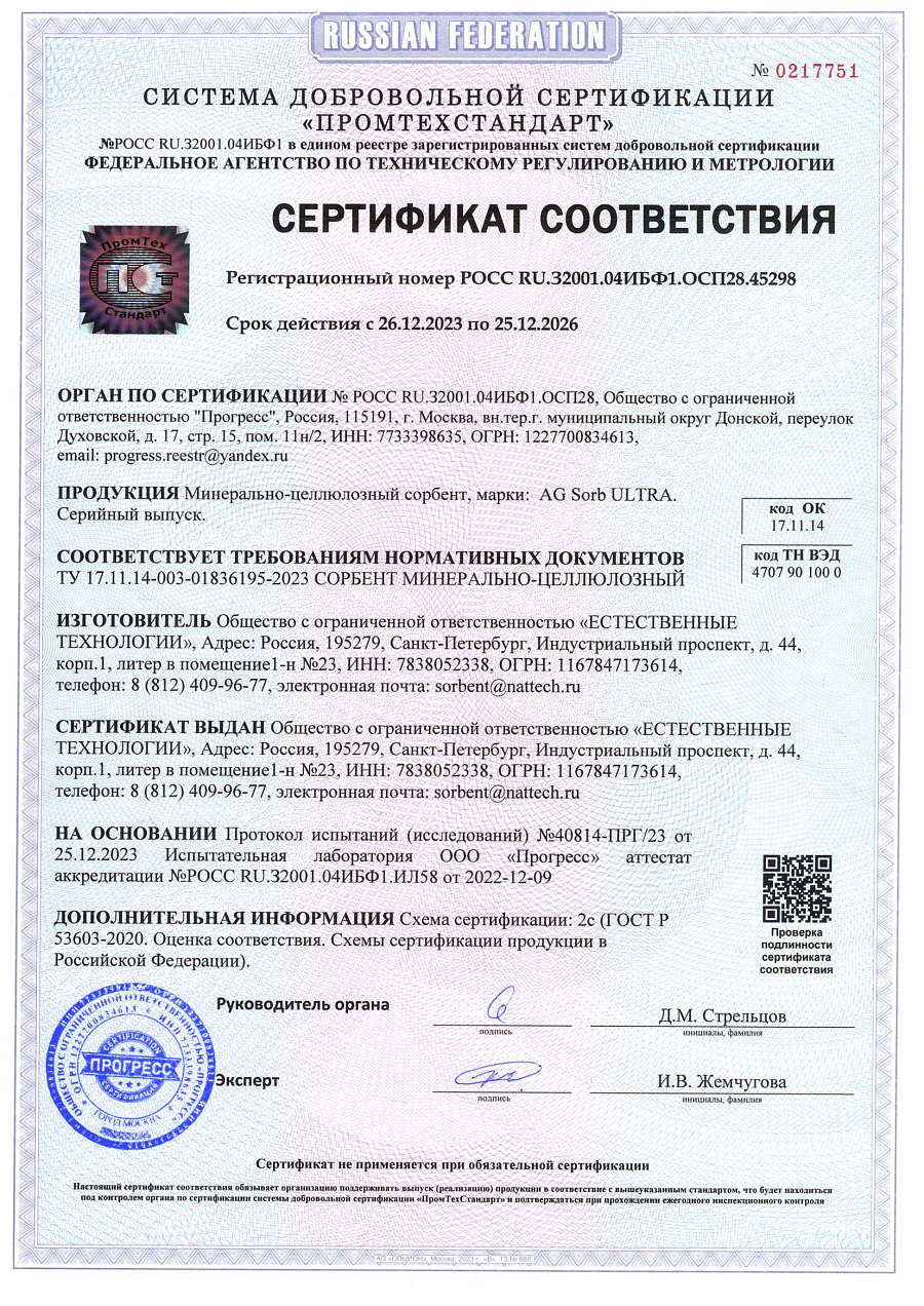 ООО «Естественные технологии» выпускает также гидрофобный минерально-целлюлозный сорбент AG Sorb Ultra — его сорбционная ёмкость и скорость поглощения нефтепродуктов превосходят на 40-50% продукцию, созданную на основе мха или торфа.
