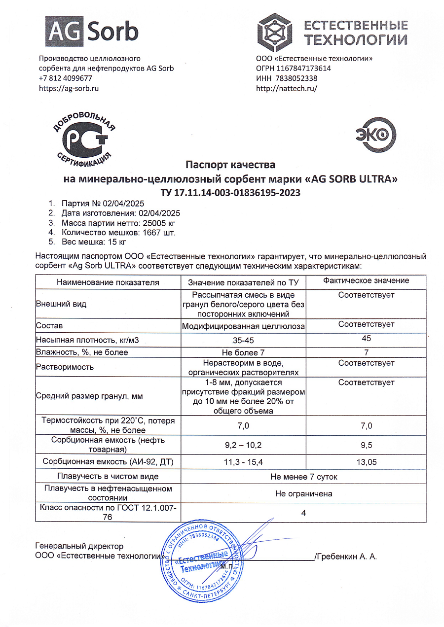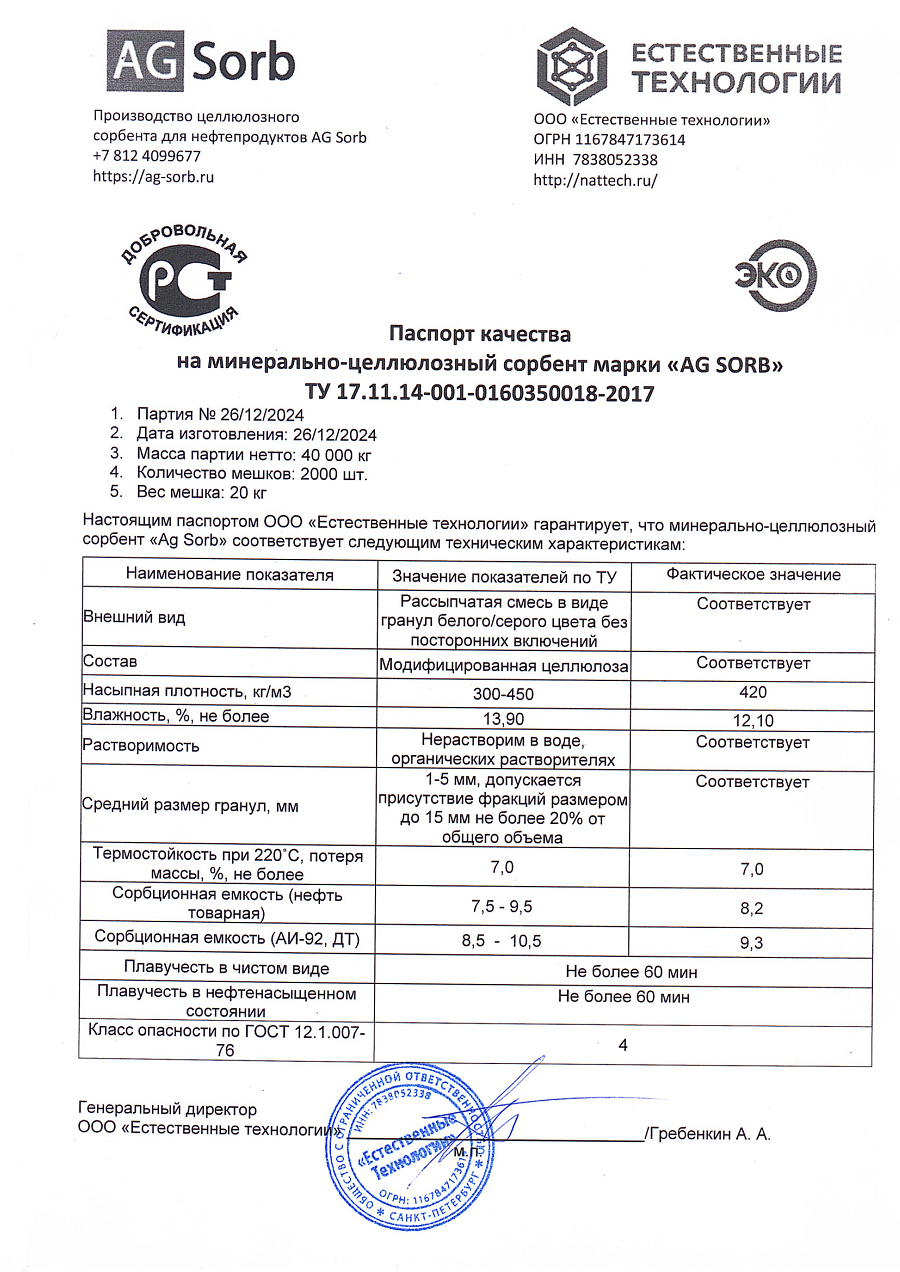 Минерально-целлюлозные сорбенты AG-Sorb обладают аналогичными характеристиками, что и зарубежные аналоги, при этом производятся на территории РФ, что позволяет сократить затраты на приобретение сорбентов на 75%. Сорбенты AG-Sorb полностью биоразлагаемы, так как изготавливаются на основе модифицированной целлюлозы, которая разлагается в природной среде благодаря деятельности различных микроорганизмов. Эти сорбенты эффективно поглощают нефть и нефтепродукты в широком диапазоне вязкости, включая эмульгированные формы (более 80 абсорбируемых веществ). Они быстро насыщаются углеводородами и удерживают их, предотвращая повторное попадание в окружающую среду. Также AG-Sorb используется для рекультивации земель и благоустройства парков.