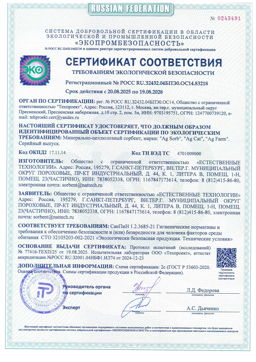 С 1 января 2025 года ООО «Естественные технологии» присоединилось к инновационному центру «Сколково». Компания поставляет минерально-целлюлозные сорбенты AG SORB крупным нефтегазовым предприятиям, таким как Газпромнефть, Роснефть, Лукойл, Татнефть, Норникель и Славнефть. Также «Естественные технологии» сотрудничают с аэродромами и морскими портами.