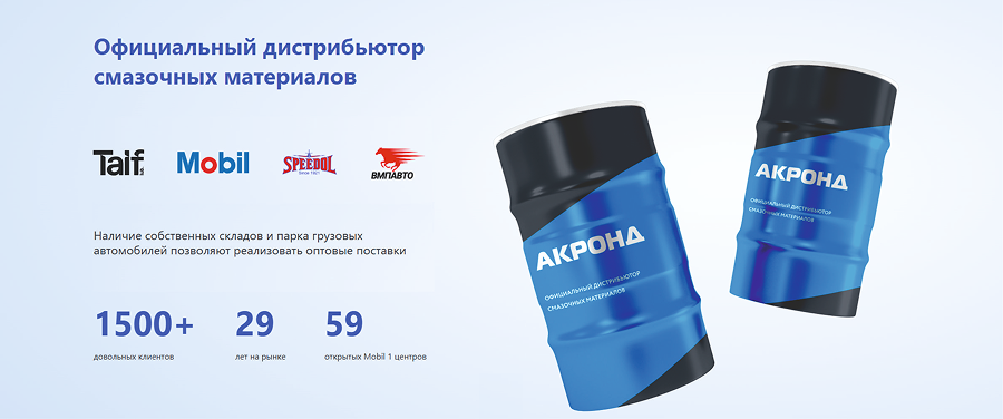 ЗАО «Акронд» — официальный дистрибьютор смазочных материалов брендов Mobil, Taif, Speedol, ВМПАВТО, Смазка.ру, а также антифризов бренда Magna.